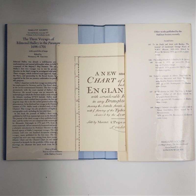 Edmond Halley was already a well-known astronomer, mathematician and natural philosopher when, in 1698, he took command of His Majesty’s Ship Paramore. The purpose of Halley’s first two voyages was to test his geomagnetical theories; in the third voyage he investigated tidal phenomena. These voyages, which received royal approval, support from the Navy, and sponsorship from the Royal Society have been regarded as the first sea journeys undertaken for purely scientific purposes. Halley’s departure on the first voyage was delayed because of his employment by Newton; and by Tsar Peter’s desire to sail in the newly-commissioned Paramore. The first voyage ended prematurely with the court martial of Halley’s first lieutenant. However, the second voyage was an eminently successful undertaking in which the Paramore made a wide sweep through the Atlantic reaching 52°24´S latitude. Halley made many observations which enabled him to produce the first isogonic map: this is also the earliest isoline map of any phenomenon. In his third and last voyage in the Paramore, in the summer of 1701, Halley made a detailed study of the English Channel. This voyage was also productive of highly original cartographic work including the first tidal chart. In this book the journals of Halley’s three voyages are published in full from manuscripts now in the British Library. The journal of the third voyage is here published for the first time, and the earlier two are compared with versions published by Alexander Dalrymple in 1773 and 1775, from different source materials. All are extensively footnoted and preceded by a scholarly introduction by Professor Thrower on the multi-faceted aspects of Halley’s important voyages. The work also contains well over one hundred documents relating to the voyages, many published for the first time. The two most original but now rare maps arising from these journeys, the Atlantic Chart and the Channel Chart (in two sheets), are reprinted in facsimile for the portfolio. Other maps, portraits, drawings, etc. illustrate this latest work from the Hakluyt Society.